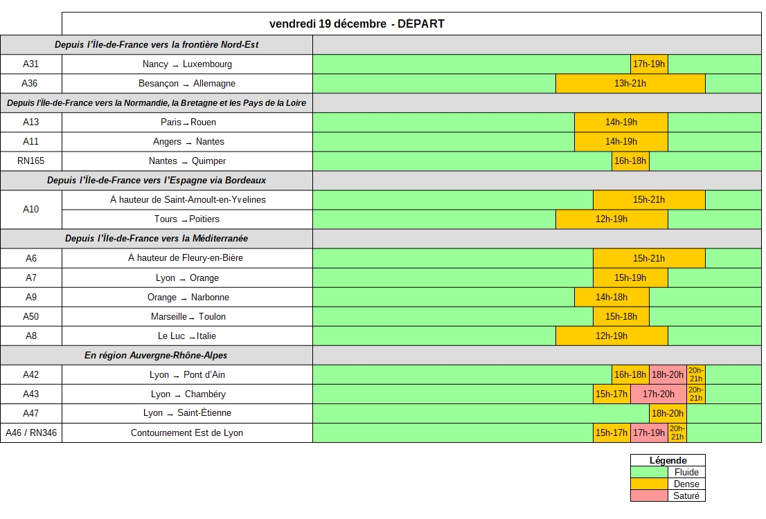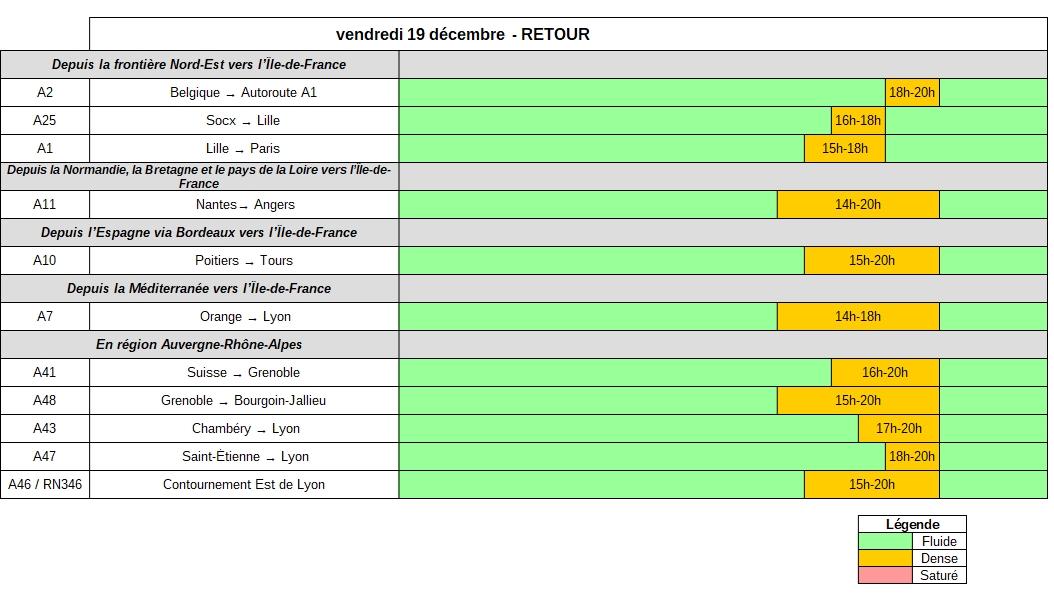 Vendredi 19 décembre, dans le sens des départs, des encombrements sont attendus dès le début de l’après-midi et devraient s’étendre jusqu’en début de soirée. Les axes en direction de la côte atlantique (A10, A11, RN165), de la Manche (A13) ou desservant la région Auvergne-Rhône-Alpes (A7, A42, A43, A46, A47) et l’arc méditerranéen (A8, A9, A50) devraient être particulièrement sollicités. En Île-de-France, au niveau des barrières de péages, la conjugaison des départs, des déplacements vers les grandes zones commerciales très fréquentées à l’approche des fêtes et les trajets pendulaires pourraient rendre difficile la circulation jusqu’en début de soirée.
