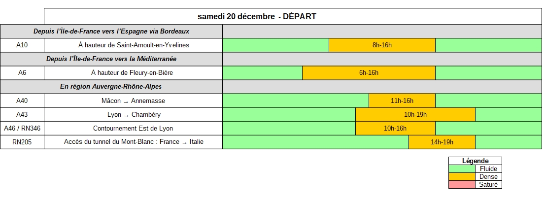 Samedi 20 décembre, dans le sens des départs, les axes de la région Auvergne-Rhône-Alpes devraient être particulièrement sollicités dès le milieu de la matinée et jusqu’en début de soirée, à l’instar des autoroutes A40, A43, A46 et de l’accès au Tunnel du Mont-Blanc.
