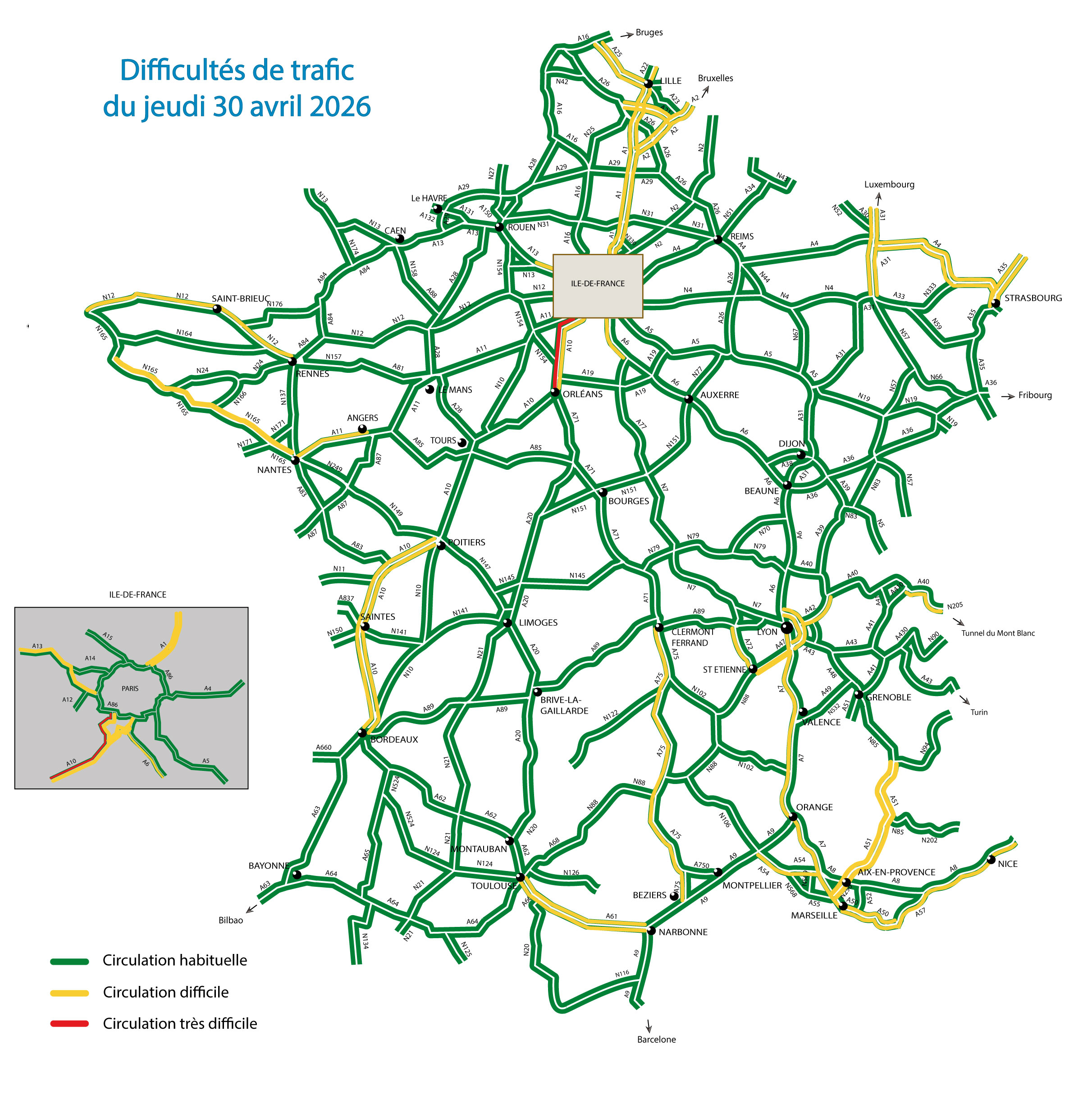 En Île-de-France, la circulation sera soutenue dès la fin de matinée en direction des différentes barrières de péage, notamment sur l’autoroute A10 et dans une moindre mesure sur l’autoroute A6. En milieu d’après-midi, l’augmentation du trafic sur ces autoroutes, conjuguée aux trajets pendulaires, pourrait entraîner des difficultés persistantes jusqu’en début de soirée. Par ailleurs, l’autoroute A13 pourrait connaître des ralentissements dès le milieu de l’après-midi.
