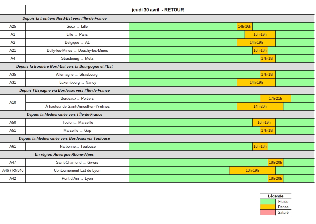 Cette fin de semaine correspond à la fin des congés scolaires de la zone C [1] et sera marquée par la possibilité d’un week-end prolongé grâce au vendredi 1er mai, jour férié. Elle correspond également à la fin des vacances pour les Pays-Bas. Jeudi 30 avril devrait être la journée la plus circulée, et ce dans les deux sens. De nombreux retours sont attendus samedi en Île-de-France et dimanche dans le quart nord-ouest du pays.