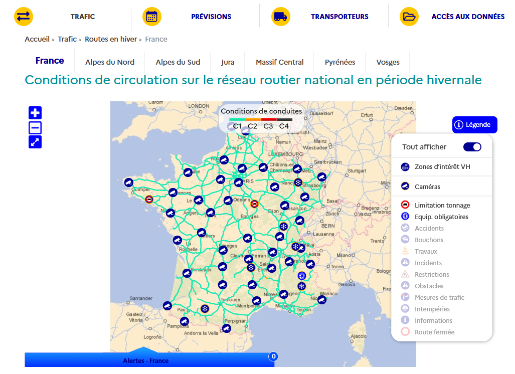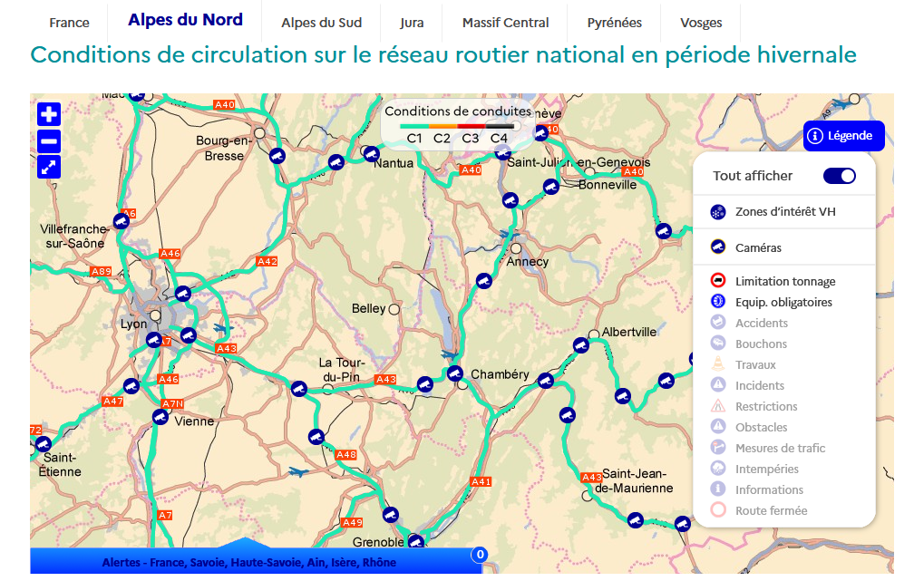 - Vous pouvez consulter ces conditions de conduite en sélectionnant la rubrique « France » (accès à la carte de France avec possibilité de se déplacer et de zoomer), ou en choisissant une des zones spécifiques prédéfinies (rubriques « Alpes du Nord », etc.).